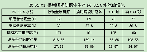 在之后的7月底和8月初,又逐步進(jìn)行了2次加球試驗(yàn),為防止往雙層隔倉板的卸料倉里竄球,用不銹鋼篩板做了一個(gè)喇叭筒,把卸料口邊緣加高了60mm。在保證質(zhì)量的前提下,臺(tái)時(shí)產(chǎn)量恢復(fù)到192.58t/h。換球后生產(chǎn)PC 32.5水泥的情況見表01-01。