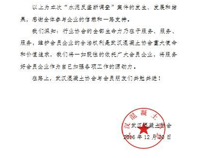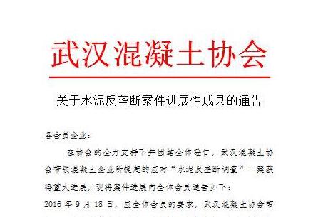 事情的原由是今年9月份,由于武漢當(dāng)?shù)厮鄡r(jià)格統(tǒng)一漲價(jià),武漢混凝土協(xié)會(huì)帶領(lǐng)140余家混凝土企業(yè)在《反壟斷調(diào)查申請書》上簽章。9月19日,湖北省物價(jià)局反壟斷分局依照法定程序受理申請人的申請后,啟動(dòng)專案組,9月20日趕赴各地涉案水泥企業(yè)開展調(diào)整取證工作。隨后,涉及壟斷漲價(jià)的水泥企業(yè)相繼坦陳了自己的問題,也向執(zhí)法部門表達(dá)愿與混凝土企業(yè)和諧共生的真實(shí)愿望。2016年10月20日,各水泥企業(yè)主要負(fù)責(zé)人約請主要混凝土企業(yè)負(fù)責(zé)人、邀請湖北省水泥協(xié)會(huì)和武漢混凝土協(xié)會(huì)的主要負(fù)責(zé)人展開了務(wù)實(shí)而友好的交談,雙方達(dá)成多項(xiàng)建設(shè)性共識。
