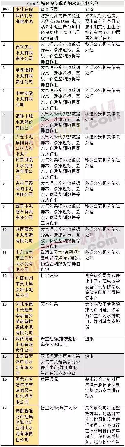 環(huán)保督察的高調(diào)執(zhí)行,一方面加強(qiáng)了督察的力度和聲勢(shì),悍衛(wèi)了環(huán)保法的權(quán)威;另一方面也曝光了企業(yè)的一些問(wèn)題。這些問(wèn)題在督察中暴露,能夠迫使地方政府主要負(fù)責(zé)人下決心解決。被環(huán)保部曝光的17家水泥企業(yè),列表如下: