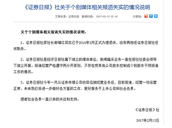 1.證券日報社原社長謝鎮(zhèn)江同志已于2016年3月正式辦理退休,沒有再擔任證券日報社任何職務。