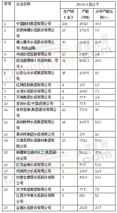 表2: 2016年熟料產(chǎn)能前20強2500t/d及以下生產(chǎn)線產(chǎn)能占比表