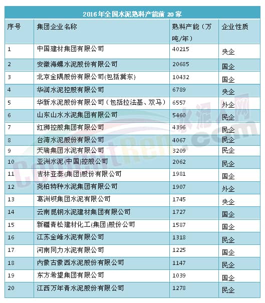 央企中國(guó)建材以水泥熟料年產(chǎn)能4億噸居榜首,國(guó)企海螺集團(tuán)穩(wěn)扎穩(wěn)打,以年產(chǎn)能2億噸,居第2。而民企山水水泥以年產(chǎn)能5460萬噸,排名第6.,更讓人驚訝的是民企亞洲水泥,憑借年產(chǎn)能2062萬噸首次進(jìn)入前十名。作為榜單前十名的???,央企華潤(rùn)水泥年產(chǎn)能有小幅上升、民企紅獅集團(tuán)年產(chǎn)能相比去年的年產(chǎn)能3543萬噸,今年增幅為19.4%,其余皆與去年差異不大。水泥人網(wǎng)整理出2016年全國(guó)水泥熟料產(chǎn)能前20家列表如下: