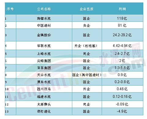 2016年年度部分水泥企業(yè)上市公司利潤表