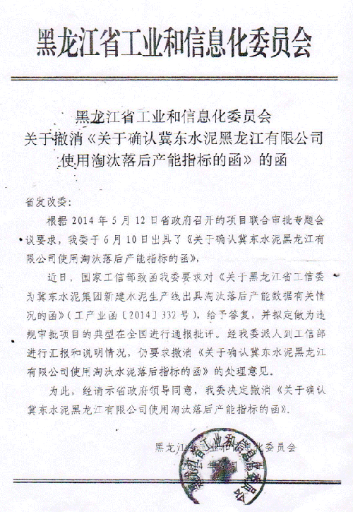 冀東水泥黑龍江新建7200t/d生產(chǎn)線項(xiàng)目為獲得項(xiàng)目批復(fù)落后產(chǎn)能置換指標(biāo)曾兩次涉嫌造假,工信部2014年9月份和2016年3月份曾兩次發(fā)函要求撤銷,并擬定做為違規(guī)審批項(xiàng)目的典型在全國(guó)進(jìn)行通報(bào)批評(píng)。