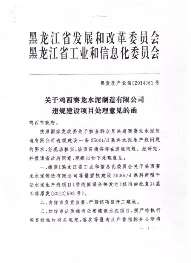 雞西賽龍水泥制造有限公司日產(chǎn)2500噸熟料項(xiàng)目是2014年在國(guó)發(fā)(2013)41號(hào)文下發(fā)后開(kāi)工建設(shè)的。因違規(guī),2014年4月24日,黑龍江省發(fā)改委、工信委聯(lián)合下發(fā)黑發(fā)改產(chǎn)業(yè)(2014)61號(hào)文《關(guān)于雞西賽龍水泥制造有限公司違建項(xiàng)目處理意見(jiàn)的函》撤銷(xiāo)了其項(xiàng)目核準(zhǔn)批復(fù)、嚴(yán)禁項(xiàng)目開(kāi)工建設(shè)。