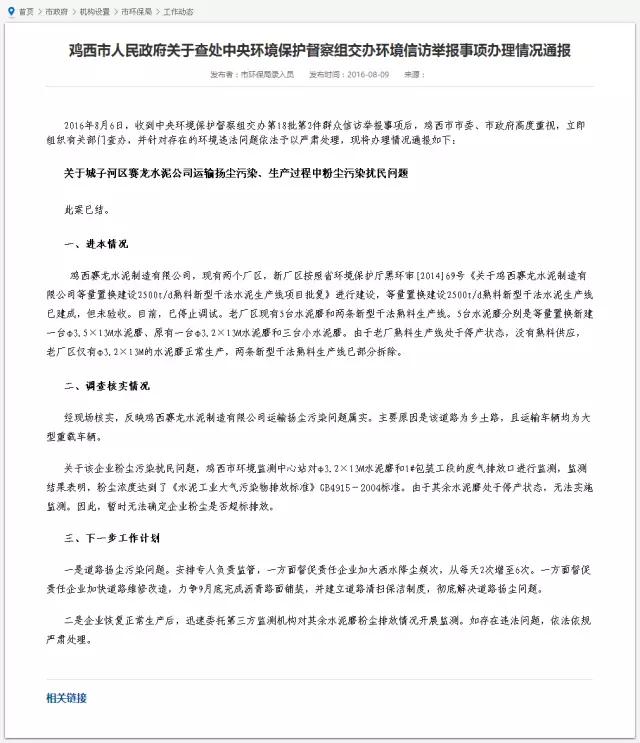 而對于雞西賽龍水泥是否涉嫌違規(guī)生產,環(huán)保局相關負責人稱:環(huán)保局只負責環(huán)保問題,針對雞西賽龍水泥環(huán)境污染的問題在2016年曾向國家環(huán)保督查組做過匯報,主要問題在于工廠進出車輛導致的道路揚塵污染。針對此問題雞西市環(huán)保局對企業(yè)做了簡單的處罰。