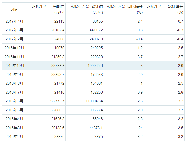 以下為2016年2月至2017年4月我國水泥生產(chǎn)量統(tǒng)計: