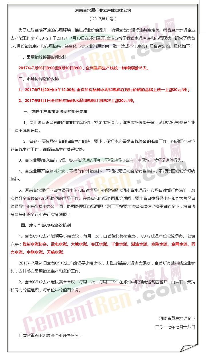 “自律公約”要求河南全省熟料生產(chǎn)線2017年7月26日8:00至8月10日8:00,統(tǒng)一錯峰停窯15天;2017年7月20日中午12:00起,全省所有品種水泥和熟料在現(xiàn)行價格的基礎上統(tǒng)一上漲30元/噸;2017年8月1日全省所有品種水泥和熟料計劃再次上漲30元/噸。