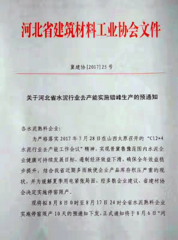 通知稱:為嚴格落實2017年7月28日在山西太原召開的“C12+4水泥行業(yè)去產(chǎn)能工作會議”精神,實現(xiàn)晉冀魯豫水泥企業(yè)健康可持續(xù)發(fā)展目標,遏制經(jīng)濟效益下滑,確保全年效益穩(wěn)步提升,結合河北省近期多雨致使企業(yè)產(chǎn)品庫存積壓嚴重的現(xiàn)狀,并為緩解夏季用電緊張局面,經(jīng)多數(shù)企業(yè)建議、河北省建材協(xié)會決定實施停窯限產(chǎn)措施。