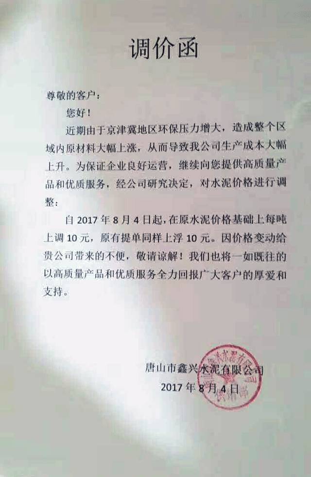 企業(yè)調(diào)價通知稱:由于近期京津冀地區(qū)環(huán)保壓力增大,造成整個區(qū)域內(nèi)原材料大幅上漲,從而導至企業(yè)生產(chǎn)成本大幅上升。為保證企業(yè)良好運營,繼續(xù)向下游客戶提供高質(zhì)量產(chǎn)品和優(yōu)質(zhì)服務,經(jīng)研究決定,對水泥價格進行上調(diào)。上調(diào)幅度在10元~30元不等,