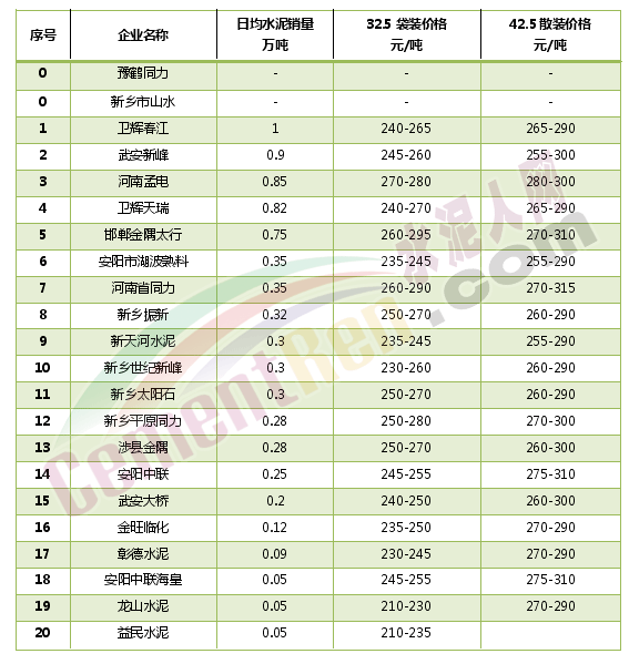 據(jù)了解,以上22家企業(yè),除豫鶴同力和新鄉(xiāng)市山水不生產(chǎn)水泥外,其他20家企業(yè)水泥日均銷量合計(jì)約76100噸,各企業(yè)日銷售量平均值約為3800噸。其中32.5袋裝水泥售價(jià)在235-295元/噸, 42.5散裝水泥售價(jià)在275-315元之間,為適應(yīng)市場需求參與競合企業(yè)水泥價(jià)格均公示為某一價(jià)格區(qū)間。如安陽中聯(lián)32.5袋水泥價(jià)格在245元-255元/噸之間,42.5散裝水泥價(jià)格在275-310元/噸之間。