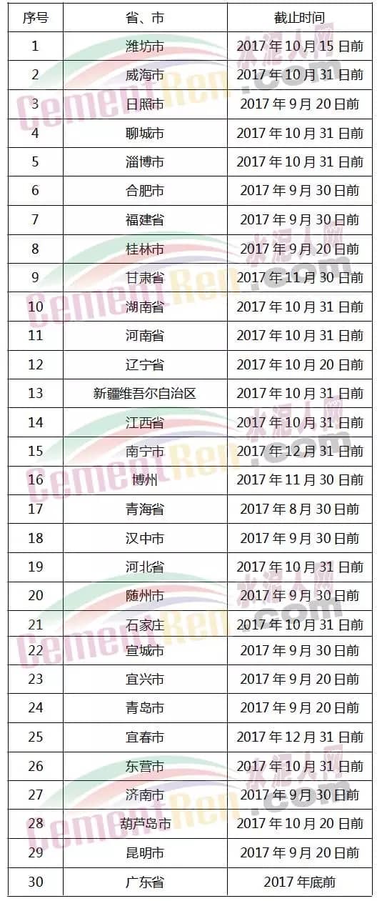 根據(jù)國務(wù)院辦公廳《控制污染物排放許可制實(shí)施方案》(國辦發(fā)〔2016〕81號(hào))、環(huán)保部《排污許可證管理暫行規(guī)定》(環(huán)水體〔2016〕186號(hào),以下簡稱《暫行規(guī)定》)和《固定污染源排污許可分類管理名錄》(2017年版)等要求,全國各省、市、區(qū)將對(duì)鋼鐵、水泥企業(yè)發(fā)布排污許可證,水泥人網(wǎng)將全國30個(gè)省市區(qū)許可證申請(qǐng)時(shí)間表整理如下: