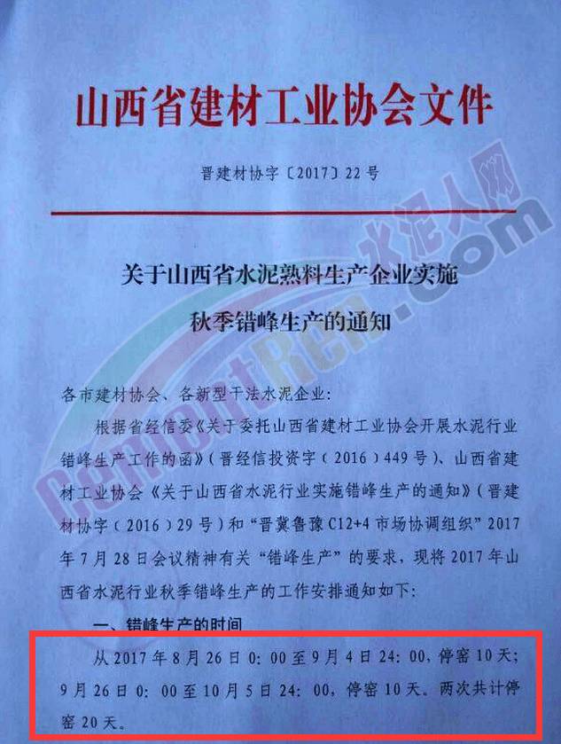 除此之外,據(jù)水泥人網(wǎng)了解,京津冀部分地區(qū)自7、8月份起已經(jīng)在執(zhí)行區(qū)域錯峰生產(chǎn)。如山西地區(qū)自8月26至9月4日,停窯10天;9月26日至10月5日,停窯10天,緊接著11月份起執(zhí)行采暖季全面停產(chǎn)。而河北地區(qū),因十九大召開,計劃10月份自律停產(chǎn)10天左右,11月份起執(zhí)行采暖季全面停產(chǎn)。