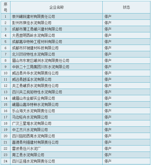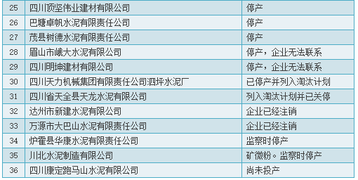 四川省工信委對(duì)全省水泥行業(yè)企業(yè)執(zhí)行的國(guó)家強(qiáng)制性能耗限額標(biāo)準(zhǔn)情況專(zhuān)項(xiàng)監(jiān)察結(jié)果顯示:四川省共有36家企業(yè)處于停產(chǎn)狀態(tài),其中27家處于完全停產(chǎn)狀態(tài),2家企業(yè)處于停產(chǎn),無(wú)法聯(lián)系狀態(tài);2家列入淘汰計(jì)劃并已關(guān)停;2家企業(yè)已注銷(xiāo);2家企業(yè)監(jiān)察時(shí)停產(chǎn),一家企業(yè)尚未投產(chǎn)。