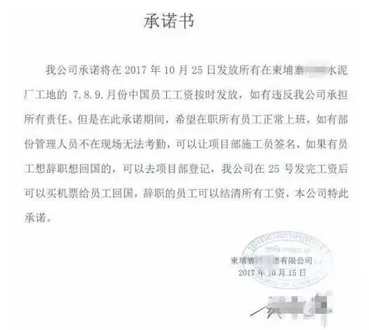 承諾書稱,將在10月25日發(fā)放所有在工地的中國員工7、8、9月份的工資,并希望在此之前工人們都能正常上班。