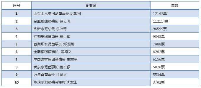借此時(shí)機(jī),水泥行業(yè)知名媒體水泥內(nèi)參積極響應(yīng)國(guó)家號(hào)召,發(fā)起“誰(shuí)是水泥行業(yè)最具影響力的企業(yè)家”投票,得票前十名企業(yè)家如下:
