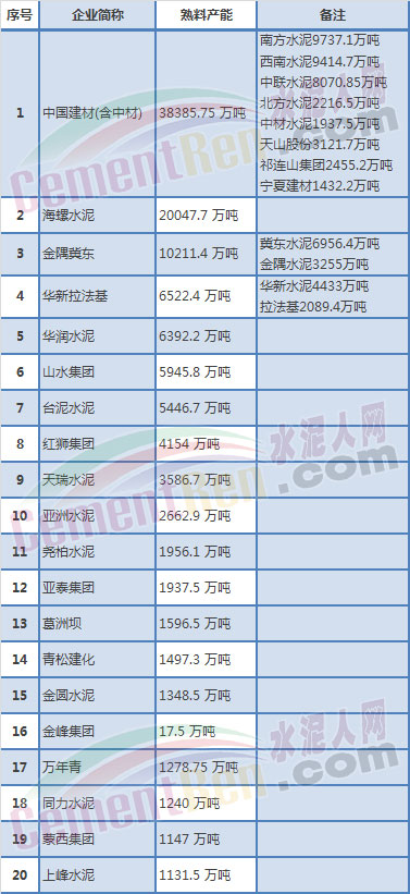 中國(guó)水泥熟料產(chǎn)能前二十強(qiáng)