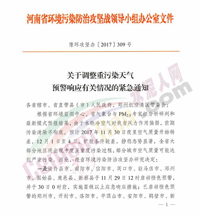 自水泥人網(wǎng)10月30日發(fā)布《河南省七十四家水泥企業(yè)停限產(chǎn)方案(含特種水泥名單)》(點擊閱讀)后,河北省多區(qū)域水泥企業(yè)也將再現(xiàn)集體停產(chǎn)。河南省環(huán)境污染防治攻堅戰(zhàn)領(lǐng)導(dǎo)小組辦公室于近日發(fā)布《關(guān)于調(diào)整重污染天氣預(yù)警響應(yīng)有關(guān)情況的緊急通知》稱:根據(jù)河南省環(huán)境監(jiān)測中心、省氣象臺與PM2.5專家組分析研判和最新模式預(yù)報結(jié)果,預(yù)計2017年11月30日夜里空氣質(zhì)量開始轉(zhuǎn)差,12月1日至4日,擴散條件較差,靜穩(wěn)態(tài)勢顯著,全省大部分地區(qū)將出現(xiàn)中度至重度污染過程,部分城市空氣質(zhì)量可能達到嚴重污染。因此,經(jīng)省環(huán)境污染防治攻堅辦研究決定: