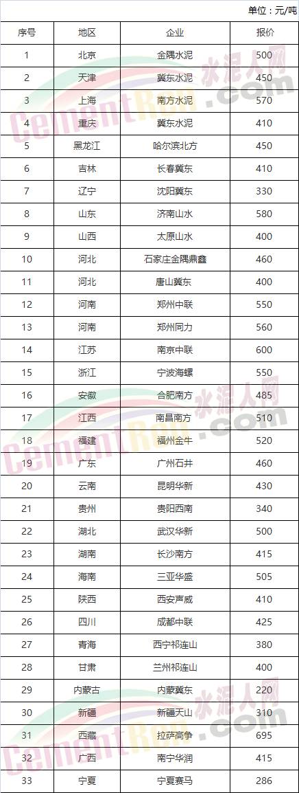 全國各區(qū)域PO42.5散裝水泥報價