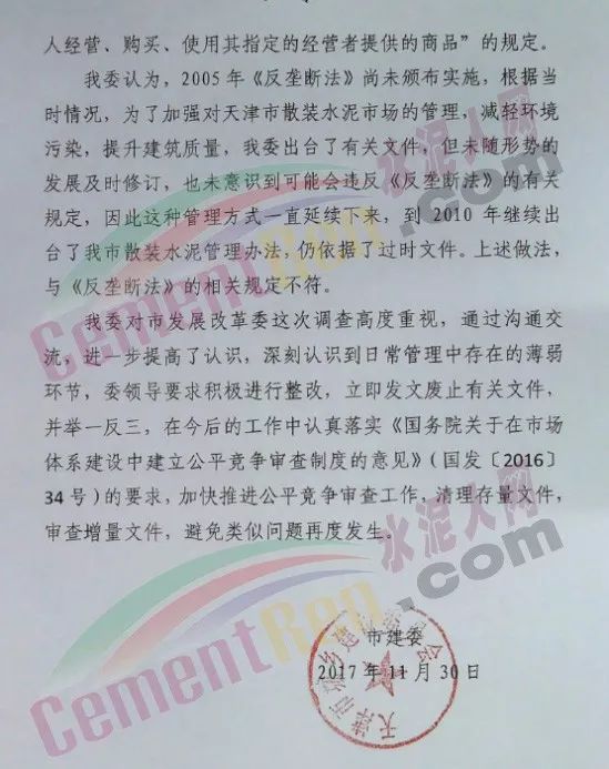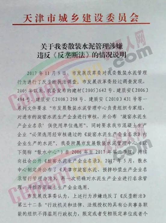 隨后,天津市城鄉(xiāng)建設(shè)委員會(huì)發(fā)布《關(guān)于我委散裝水泥管理涉嫌違反<反壟斷法>的情況說(shuō)明》,明確表示:通過(guò)溝通交流,進(jìn)一步提高了認(rèn)識(shí),深刻認(rèn)識(shí)到日常管理中存在的薄弱環(huán)節(jié),委領(lǐng)導(dǎo)要求積極進(jìn)行整改,立即發(fā)文廢止相關(guān)文件。