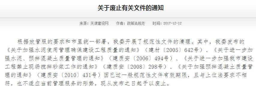 12月中旬,天津市場(chǎng)城鄉(xiāng)建設(shè)委員會(huì)發(fā)布《關(guān)于廢止有關(guān)文件的通知》,《關(guān)于加強(qiáng)水泥使用管理確保建設(shè)工程質(zhì)量的通知》(建材〔2005〕642號(hào))、《關(guān)于進(jìn)一步加強(qiáng)水泥、預(yù)拌混凝土質(zhì)量管理的通知》(建質(zhì)安〔2006〕494號(hào))、《關(guān)于進(jìn)一步加強(qiáng)我市建設(shè)工程禁止現(xiàn)場(chǎng)攪拌砂漿工作的通知》(建質(zhì)安〔2008〕298號(hào))、《關(guān)于加強(qiáng)預(yù)拌混凝土質(zhì)量管理的通知》(建質(zhì)安〔2010〕431號(hào))等文件。