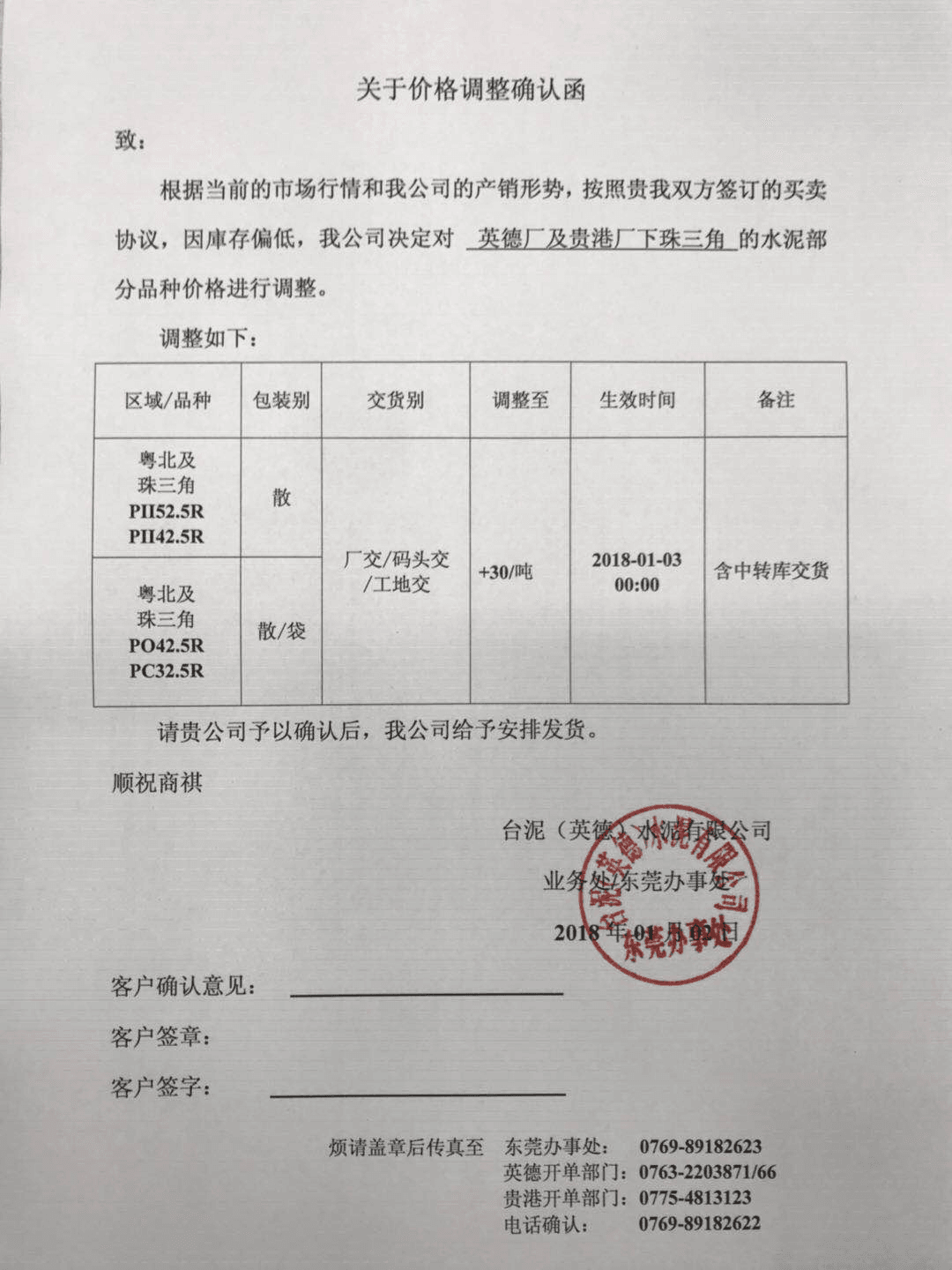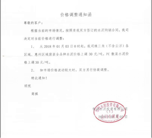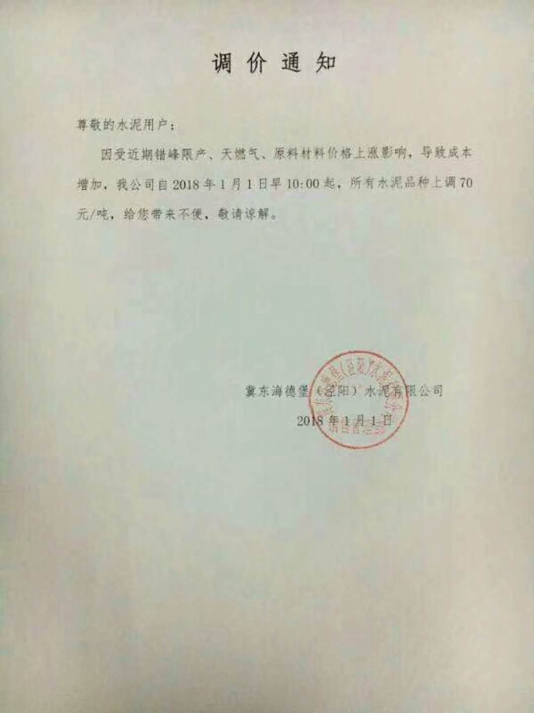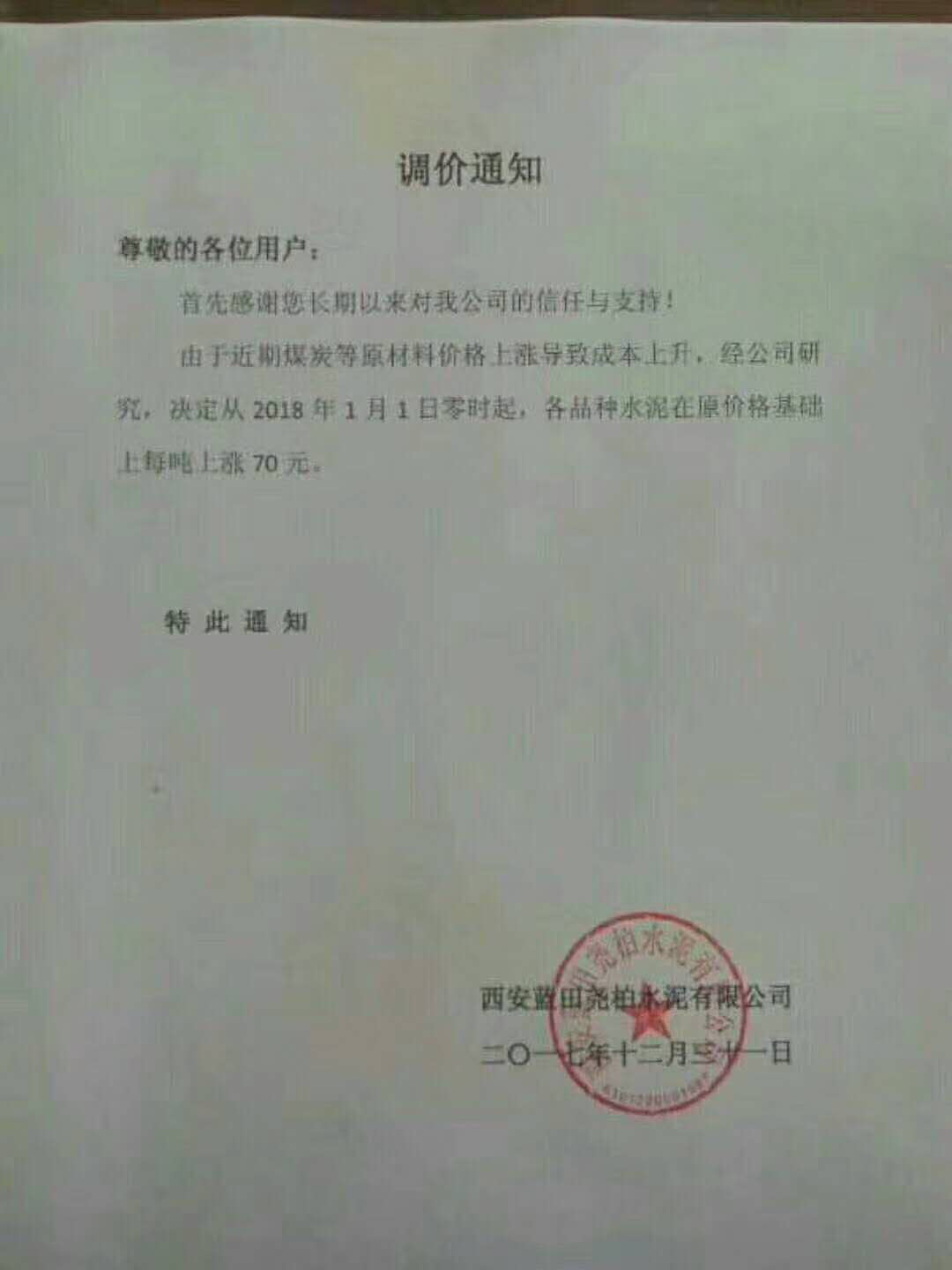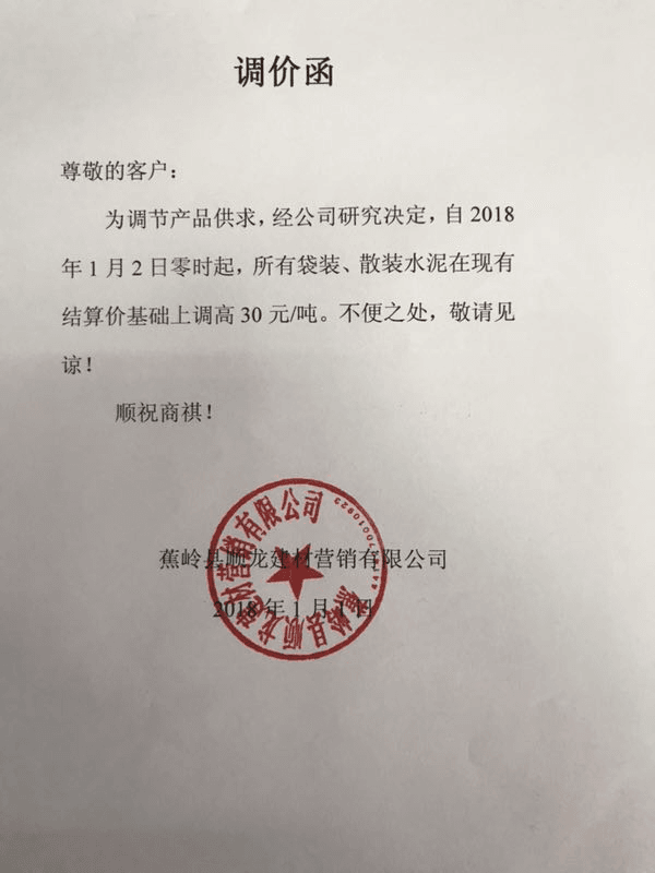 除此之外,據(jù)水泥人網(wǎng)了解,陜西地區(qū)在2017年年末也進(jìn)行了最后一輪漲價,并且因受到錯峰生產(chǎn)、環(huán)保督查等方面的影響,目前陜西部分地區(qū)水泥企業(yè)已無熟料可賣。部分漲價函如下: