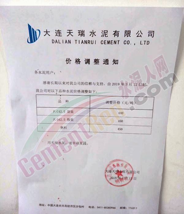 3月12日,遼寧大連地區(qū)主導企業(yè)發(fā)布提價通知,各標號水泥統(tǒng)一上調100元/噸。調價后PO42.5散裝水泥出廠價450元/噸,PC42.5袋裝水泥出廠價440元/噸。