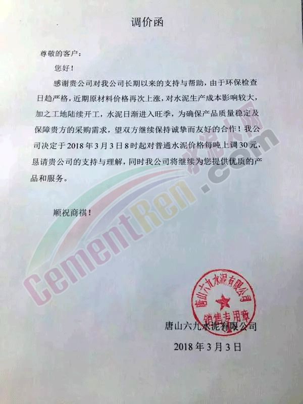 3月3日唐山六九水泥有限公司發(fā)調價函稱,由于環(huán)保檢查日趨嚴格,近期原材料價格再度上漲,對水泥生產(chǎn)成本影響較大,加之工地陸續(xù)開工,水泥日漸進入旺季,為確保產(chǎn)品質量穩(wěn)定及保障下游客戶采購需求,公司決定對普通水泥價格上調30元/噸。
