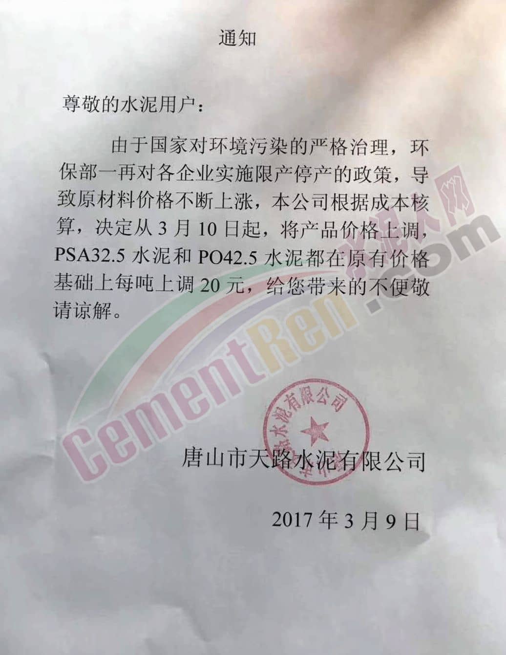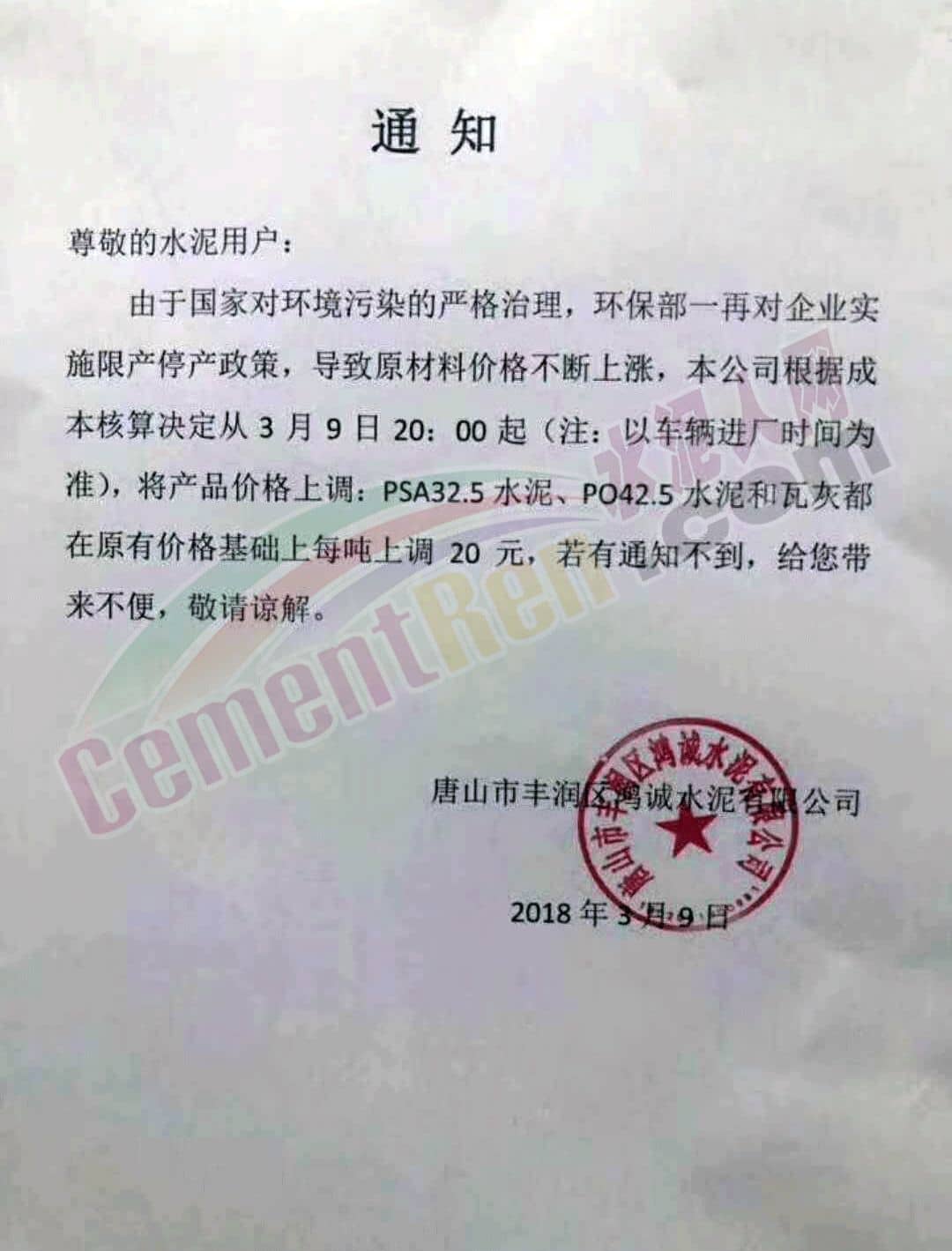 3月9日唐山市豐潤區(qū)鴻誠水泥有限公司發(fā)布通知稱由于國家對環(huán)境污染的嚴格治理,環(huán)保部一再對企業(yè)實施限產(chǎn)停產(chǎn)政策,導致原材料價格不斷上漲,公司根據(jù)成本核算決定自3月9日20:00起水泥價格在原有價格基礎上上調20元/噸。