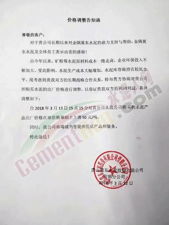 3月12日唐山區(qū)域龍頭企業(yè)唐山冀東水泥股份有限公司發(fā)出價格調整告知函,告知下游客戶因礦粉等原材料成本一路走高,企業(yè)環(huán)保投入不斷加大,水泥生產(chǎn)成本增加,水泥庫存維持在較低水平,為保證正常的銷售供應自3月13日起各標號水泥出廠價上調50元/噸。