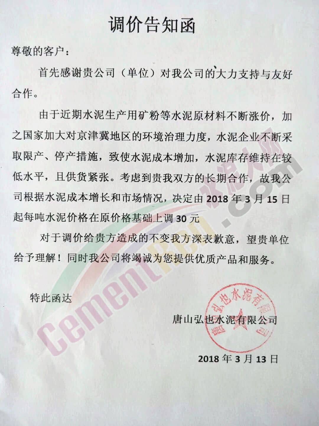 3月13日,唐山弘也水泥發(fā)布調價通知,決定自3月15日起每噸水泥價格在原價格基礎上上調30元/噸。