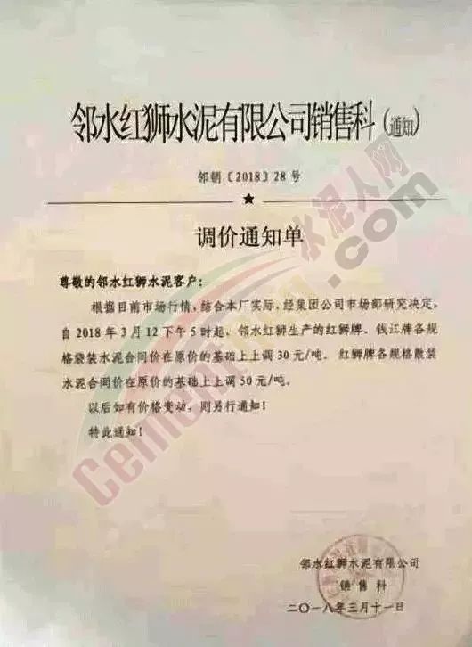3月11日鄰水紅獅水泥有限公司銷售科發(fā)布調價通知自3月12日下午5時起上調旗下紅獅牌、錢江牌各規(guī)格袋裝水泥價格30元/噸,紅獅牌各規(guī)格散裝水泥上調50元/噸。