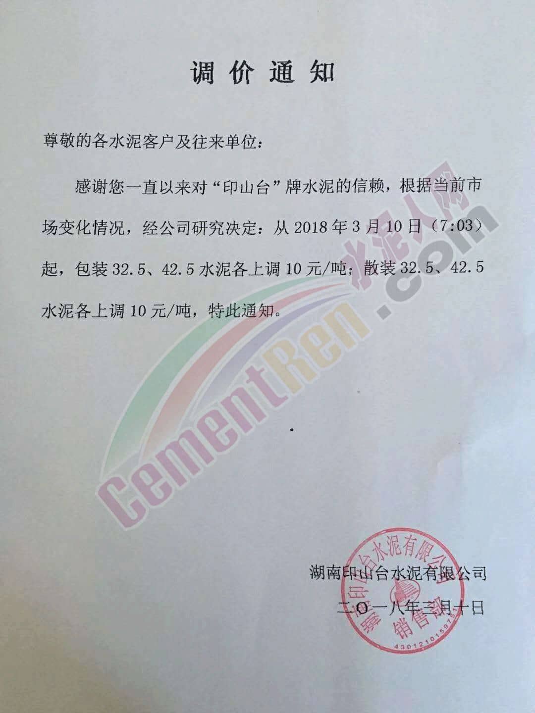 3月10日湖南區(qū)域印山臺水泥有限公司通知自3月10日起對旗下各規(guī)格水泥價格上調10元/噸。