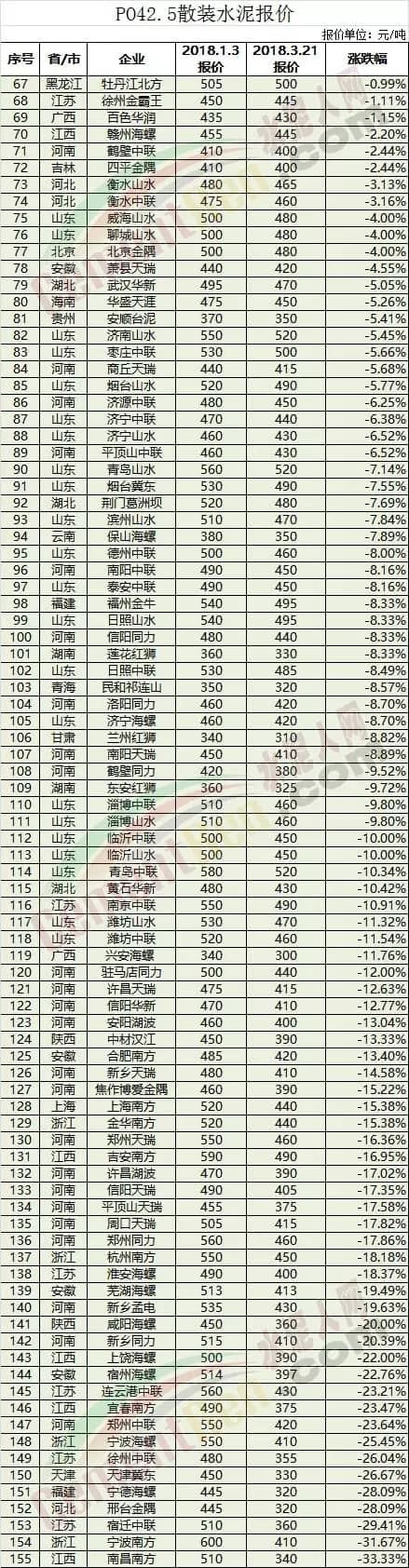 以上數(shù)據(jù)顯示自本年度1月份以來,內(nèi)蒙、遼寧、黑龍江、湖南、陜西、甘肅、新疆、廣東、廣西、云南、重慶、 河北、河南等省自治區(qū)水泥價(jià)格均有上調(diào),上調(diào)幅度最高為45%以上。