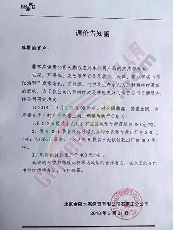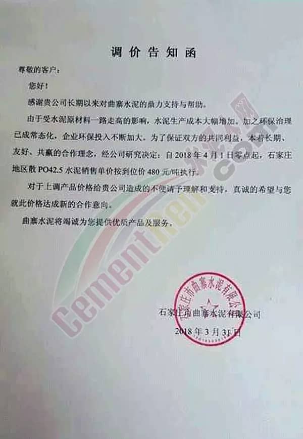 昨日,石家莊曲寨水泥也發(fā)布了提價通知,通知自2018年4月1日起石家莊地區(qū)散裝PO42.5水泥銷售單價按到位價480元/噸執(zhí)行。
