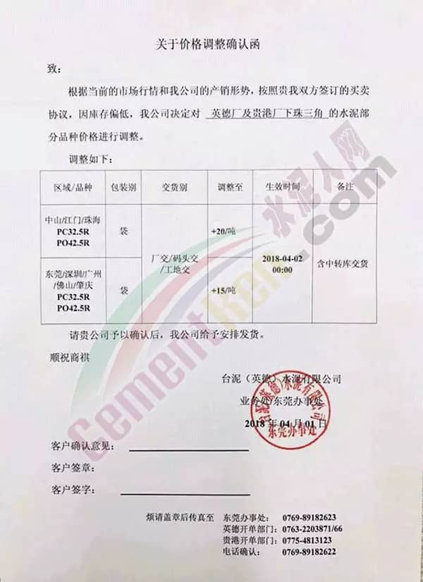 水泥人網(wǎng)通訊員消息,近兩日廣東省部分企業(yè)發(fā)布提價通知,其中臺泥水泥廠的價格調(diào)整確認函提到因庫存偏低決定對英德廠及貴港廠下珠三角的水泥部分品種價格進行調(diào)整。上調(diào)幅度在15~20元/噸不等。