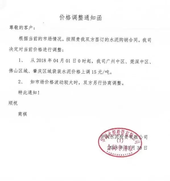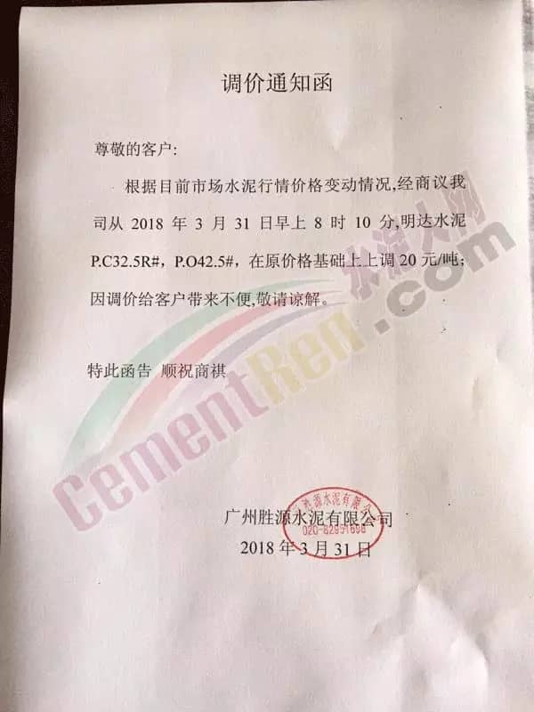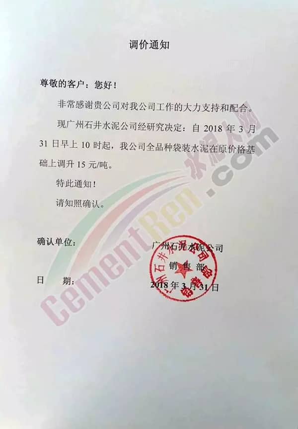 根據(jù)當前市場形勢及我司生產(chǎn)情況,我公司決定于2018年3月31日上午8:00上調(diào)各品種袋裝、散裝水泥20元/噸,價格上調(diào)以我司出廠過磅時間為準,如您繼續(xù)安排提貨,則視為認同此次價格調(diào)整。順祝商祺!