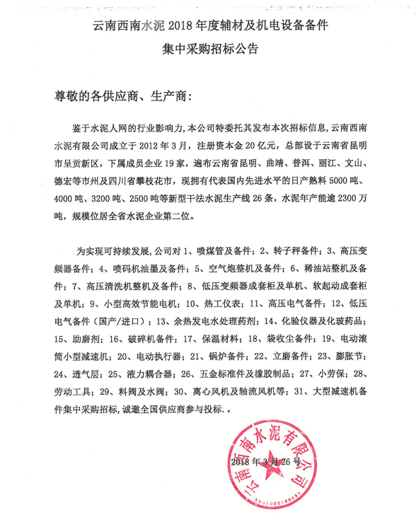 鑒于水泥人網(wǎng)的行業(yè)影響力,本公司特委托其發(fā)布本次招標(biāo)信息,云南西南水泥有限公司成立于2012年3月,注冊資本金20億元,總部設(shè)于云南省昆明市呈貢新區(qū),下屬成員企業(yè)19家,遍布云南省昆明、曲靖、普洱、麗江、文山、德宏等市州及四川省攀枝花市,現(xiàn)擁有代表國內(nèi)先進水平的日產(chǎn)熟料5000噸、4000噸、3200噸、2500噸等新型干法水泥生產(chǎn)線26條,水泥年產(chǎn)能逾2300萬噸,規(guī)模位居全省水泥企業(yè)第二位。