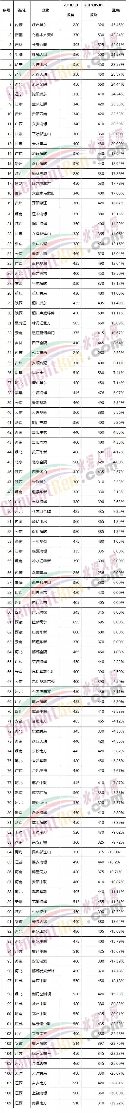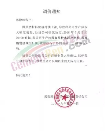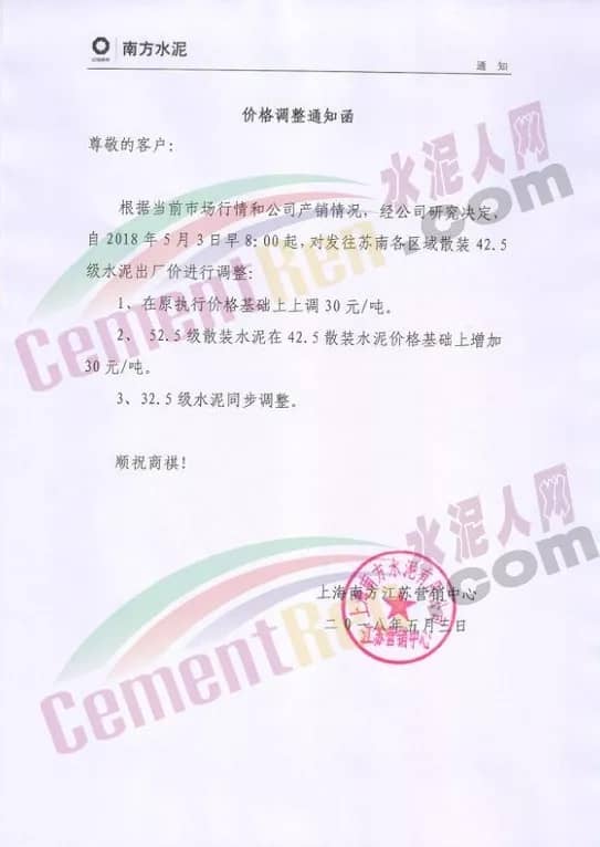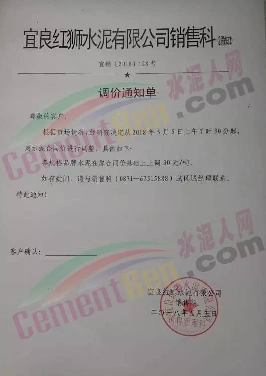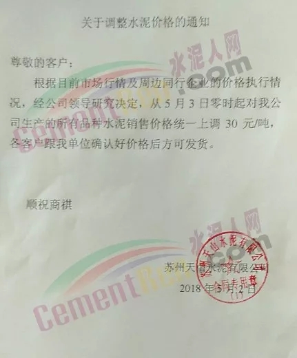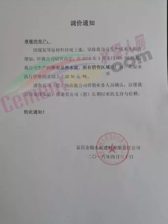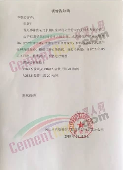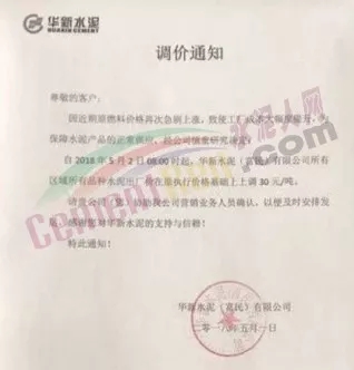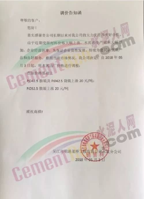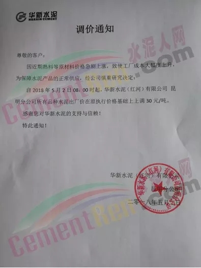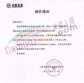 華新水泥發(fā)布調(diào)價(jià)通知稱(chēng),因近期熟料等原材料價(jià)格急劇上漲,致使工廠成本大幅度上升,為保障水泥產(chǎn)品的正常供應(yīng),自2018年5月2日起各品種水泥在原執(zhí)行價(jià)格基礎(chǔ)上上調(diào)30元/噸。