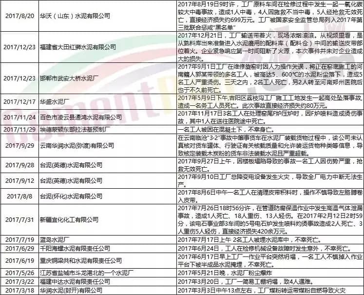2017年水泥人網(wǎng)曾報(bào)道過的與水泥企業(yè)安全生產(chǎn)相關(guān)的事故共17起,詳情如下: