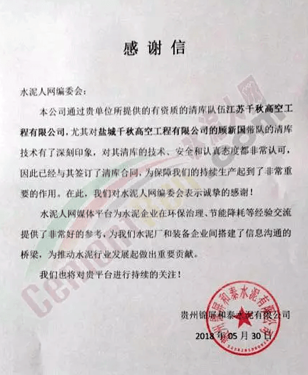 作為行業(yè)最大的新媒體平臺(tái),水泥人網(wǎng)每天通過線上線下發(fā)出大量信息,亦收到諸多反饋。日前,水泥人網(wǎng)信息平臺(tái)收到貴州錦屏和泰水泥有限公司發(fā)來的感謝信稱,通過水泥人網(wǎng)所提供的有資質(zhì)的清庫(kù)隊(duì)伍江蘇千秋高空工程有限公司,對(duì)其公司顧新國(guó)帶隊(duì)的清庫(kù)技術(shù)有了深刻的印象。對(duì)其清庫(kù)技術(shù),安全和認(rèn)真態(tài)度都非常認(rèn)可。為保障企業(yè)的持續(xù)生產(chǎn)起到了非常重要的作用,故對(duì)水泥人網(wǎng)表示感謝。