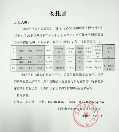 昨日(7月9日),西安堯柏物資有限公司致函水泥人網(wǎng),鑒于水泥人網(wǎng)是業(yè)內(nèi)最大的新媒體平臺,在水泥行業(yè)有著很大的影響力和行業(yè)資源,特委托對2臺膠帶機的項目進(jìn)行采購。