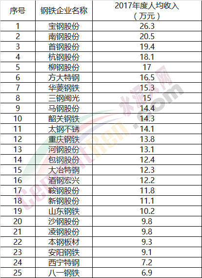 2017年度上市鋼鐵公司員工薪酬排行榜