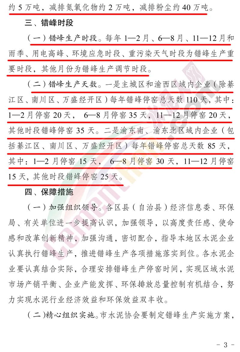 渝東南、渝東北區(qū)域內(nèi)企業(yè)(包括綦江區(qū)、南川區(qū)、萬(wàn)盛經(jīng)開(kāi)區(qū))每年錯(cuò)峰停窯總天數(shù)85天,其中: 1-2月停窯15天, 6-8月停窯30天,11-12月停窯15天,其他時(shí)段錯(cuò)峰停窯25天。