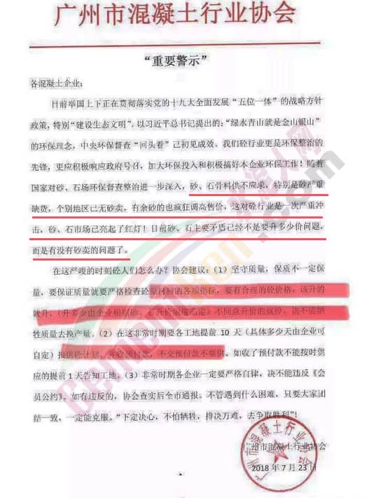 廣州市混凝土行業(yè)協(xié)會(huì)發(fā)布“重要警示”稱,隨著國(guó)家對(duì)砂、石場(chǎng)環(huán)保督查整治進(jìn)一步深入,砂、石骨料供不應(yīng)求,特別是砂嚴(yán)重缺貨,個(gè)別地區(qū)已經(jīng)無(wú)砂可賣,有余砂的也瘋狂調(diào)高售價(jià),這對(duì)砼行業(yè)是一次嚴(yán)重沖擊,砂石市場(chǎng)已亮起了紅燈!目前砂、石主要矛盾已經(jīng)不是升多少價(jià)問(wèn)題了,而是有沒(méi)有砂賣的問(wèn)題了。