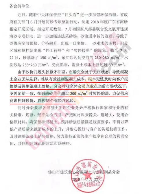 一、隨著國家環(huán)保督查整治工作進(jìn)一步深入,目前砂石骨料市場供不應(yīng)求,特別是自今年6月份以來,短短一個月內(nèi),砂的價格出現(xiàn)幾近失控式的上漲,截止2018年7月22日,砂的到廠價格已經(jīng)在6月份單價的基礎(chǔ)上上漲了120-150元/噸,即便是現(xiàn)金采購的前提下仍然一砂難求,直接導(dǎo)致混凝土企業(yè)材料成本巨幅上升,預(yù)拌混凝土作為下游行業(yè),無力改變材料市場的供求關(guān)系局面,全行業(yè)由此受到極為嚴(yán)重的沖擊,已經(jīng)普遍陷入無砂可用、嚴(yán)重虧本經(jīng)營的窘境,混凝土供銷市場完全處于無序狀態(tài);