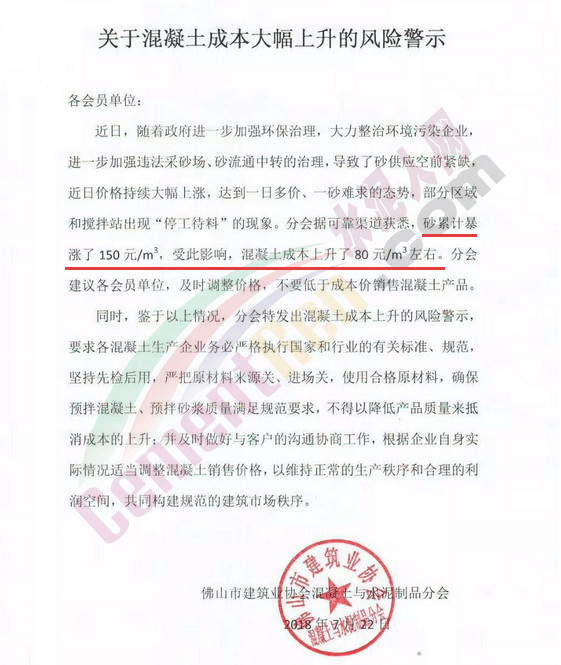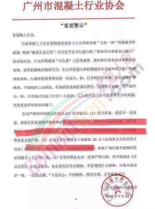 廣州市混凝土行業(yè)協(xié)會發(fā)布“重要警示”稱,隨著國家對砂、石場環(huán)保督查整治進(jìn)一步深入,砂、石骨料供不應(yīng)求,特別是砂嚴(yán)重缺貨,個別地區(qū)已經(jīng)無砂可賣,有余砂的也瘋狂調(diào)高售價,這對砼行業(yè)是一次嚴(yán)重沖擊,砂石市場已亮起了紅燈!目前砂、石主要矛盾已經(jīng)不是升多少價問題了,而是有沒有砂賣的問題了。