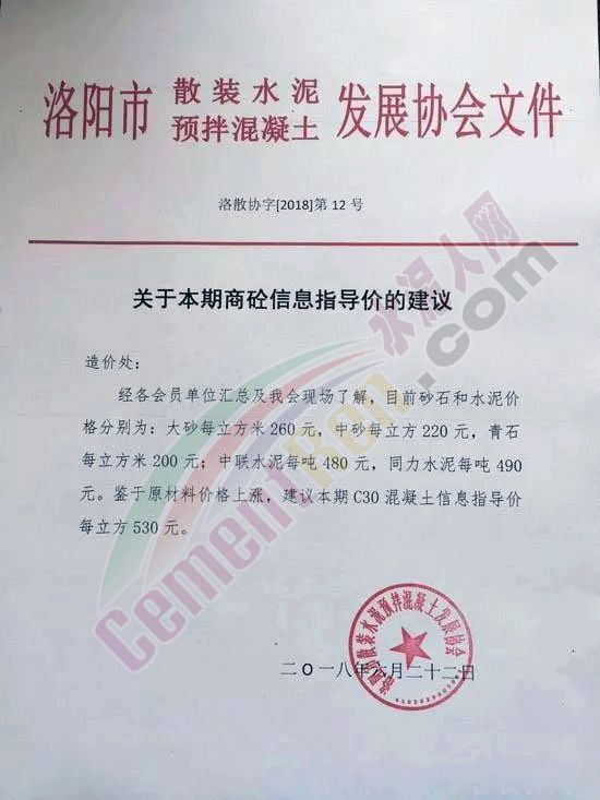 洛陽市散裝水泥預(yù)拌混凝土發(fā)展協(xié)會發(fā)布關(guān)于本期商砼信息指導(dǎo)價的建議,建議稱,經(jīng)各會員單位匯總及協(xié)會現(xiàn)場了解,目前砂石和水泥價格分別為:大砂每立方米260元,中砂每立方220元,青石每立方200元,中聯(lián)水泥480元/噸,同力水泥490元/噸,鑒于原材料價格上漲,建議本期C30混凝土信息指導(dǎo)價每立方530元。