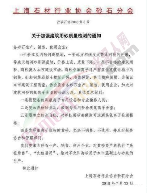近日,上海市混凝土行業(yè)協(xié)會發(fā)布緊急通知,要求各預(yù)拌混凝土生產(chǎn)企業(yè)、預(yù)拌砂漿企業(yè)加大用砂的氯離子含量檢測力度,禁止使用海砂用于生產(chǎn)。要求全市所有預(yù)拌混凝土生產(chǎn)企業(yè)、干混砂漿生產(chǎn)企業(yè)嚴(yán)把質(zhì)量關(guān),原材料要嚴(yán)格執(zhí)行“先檢后用”,絕對不允許海砂用于混凝土與砂漿的生產(chǎn)。