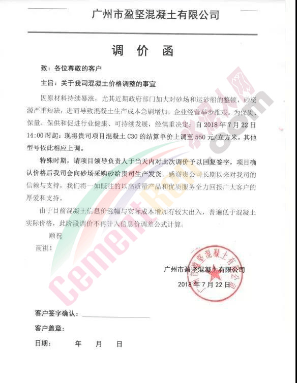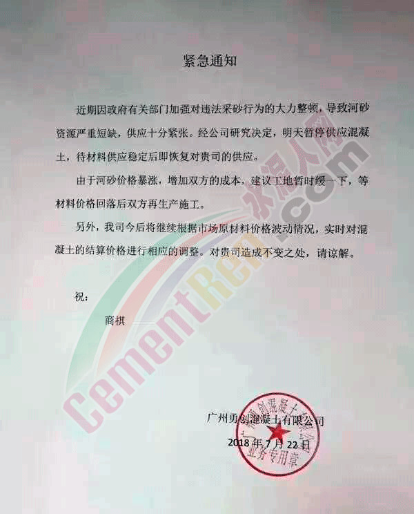日前,廣州多家混凝土企業(yè)發(fā)布斷供通知稱自即日起暫停供應(yīng)混凝土,待材料供應(yīng)穩(wěn)定后再恢復(fù)對客戶的供應(yīng)。同時建議工地暫緩施工,等材料價格回落后再行施工。并且混凝土價格會隨行就市,依據(jù)材料價格及供應(yīng)情況實(shí)時對混凝土的結(jié)算價格進(jìn)行相應(yīng)的調(diào)整。隨時漲價、隨時斷供,或成常態(tài)。